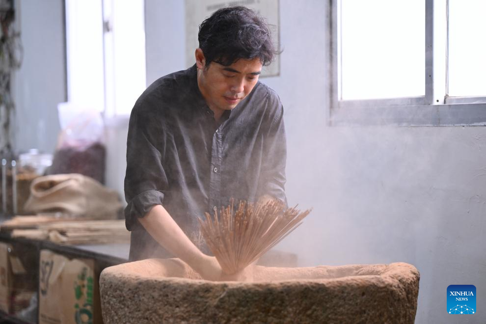 Chen Bin, an incense-making artisan, makes natural incense by hand in Xianyou County, southeast China's Fujian Province, on Sept. 24, 2025. Xianyou County is a significant trading and distribution center for agarwood and sandalwood in China. In recent years, the county has been working on the development of its incense-related business by leveraging the abundance in raw materials, a mature incense-making industrial chain, and online and offline sales networks there.