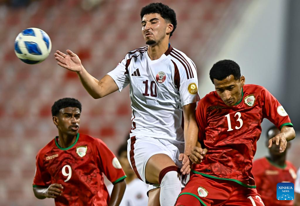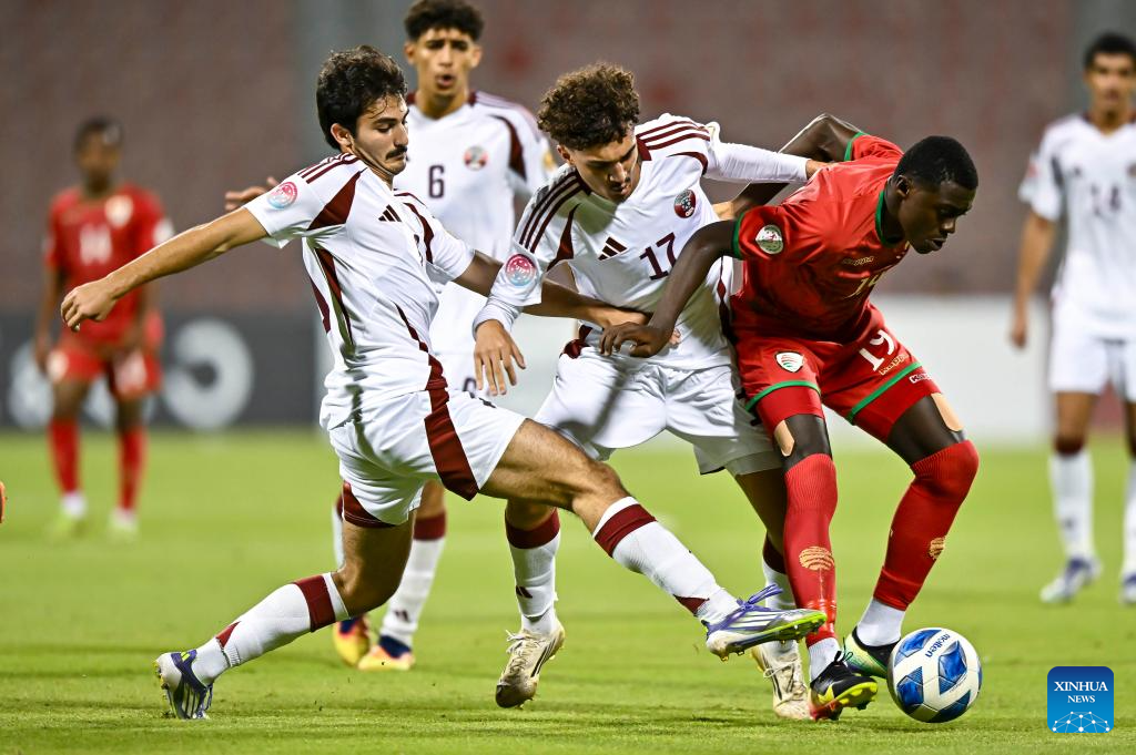 Mubarak Al Amri (R) and Namar Talal Al Amri of Oman vies with Eissa Salem (C) of Qatar during the Arab Gulf Cup Football Federation (AGCFF) U-17 Gulf Cup Qatar 2025 Group A football match between Oman and Qatar in Doha, Qatar, Sept. 24, 2025 (Photo by Nikku/Xinhua)