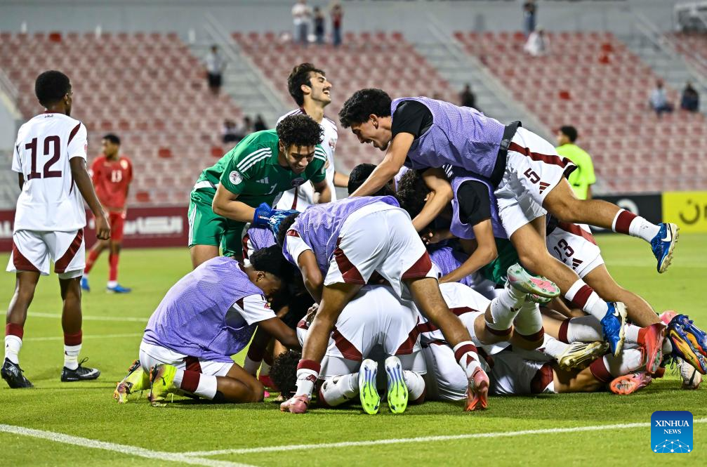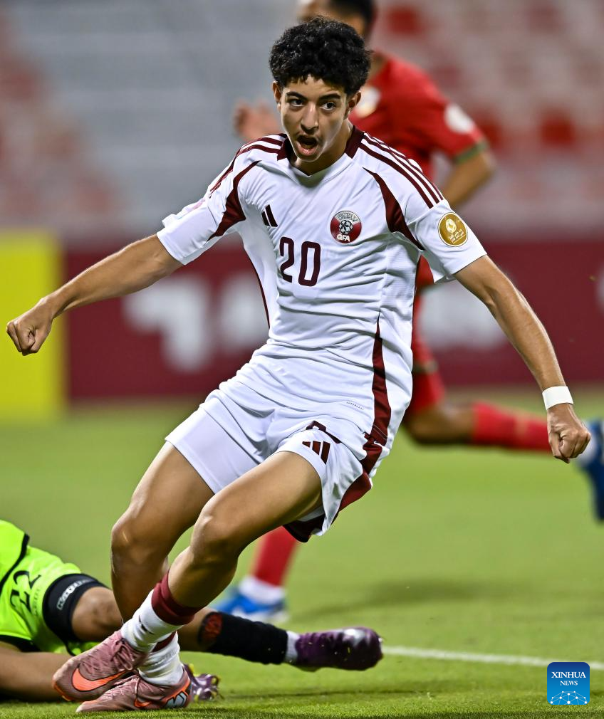 Players of Qatar celebrate after winning the Arab Gulf Cup Football Federation (AGCFF) U-17 Gulf Cup Qatar 2025 Group A football match between Oman and Qatar in Doha, Qatar, Sept. 24, 2025 (Photo by Nikku/Xinhua)