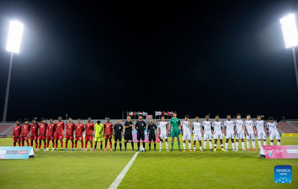 Players and referees line up prior to the Arab Gulf Cup Football Federation (AGCFF) U-17 Gulf Cup Qatar 2025 Group A football match between Oman and Qatar in Doha, Qatar, Sept. 24, 2025 (Photo by Nikku/Xinhua)