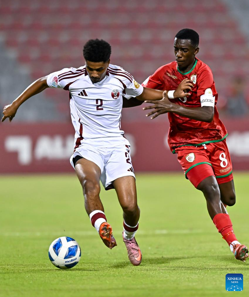 Awadh Khamisal Sadi (R) of Oman vies with Azan Hani Mohamed (C) of Qatar during the Arab Gulf Cup Football Federation (AGCFF) U-17 Gulf Cup Qatar 2025 Group A football match between Oman and Qatar in Doha, Qatar, Sept. 24, 2025 (Photo by Nikku/Xinhua)