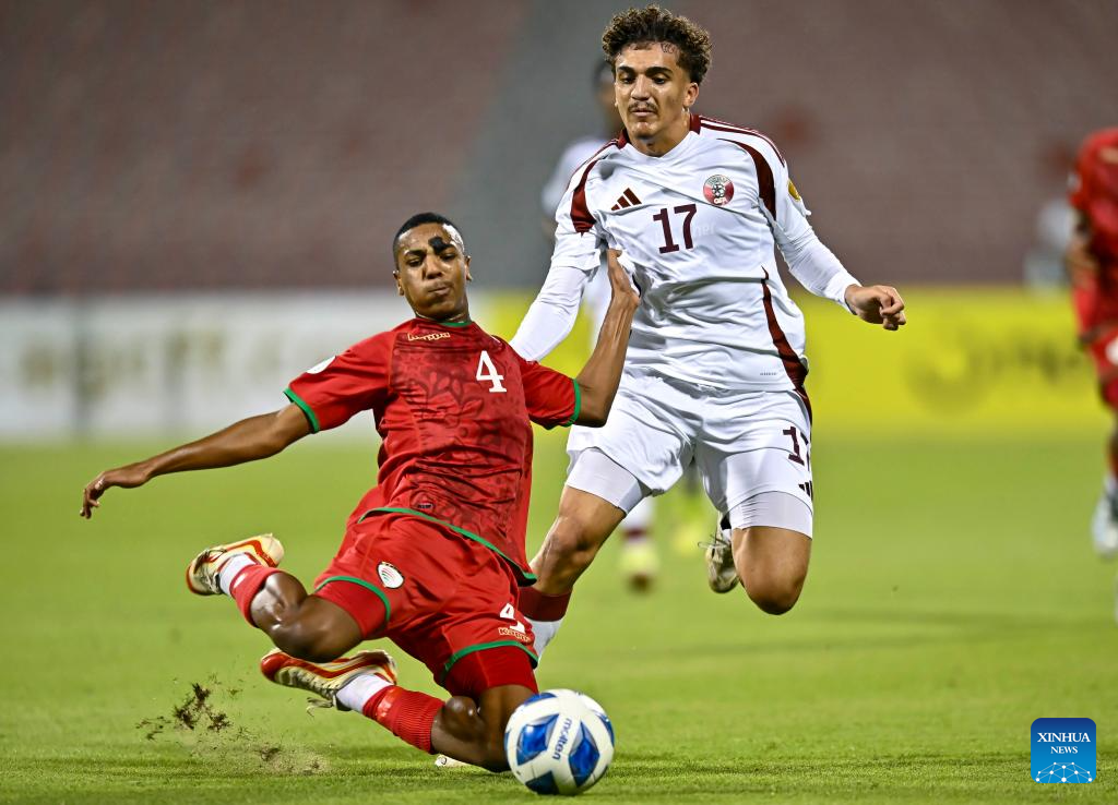 Mohammed Al Jabri (L) of Oman vies with Azan Hani Mohamed of Qatar during the Arab Gulf Cup Football Federation (AGCFF) U-17 Gulf Cup Qatar 2025 Group A football match between Oman and Qatar in Doha, Qatar, Sept. 24, 2025 (Photo by Nikku/Xinhua)