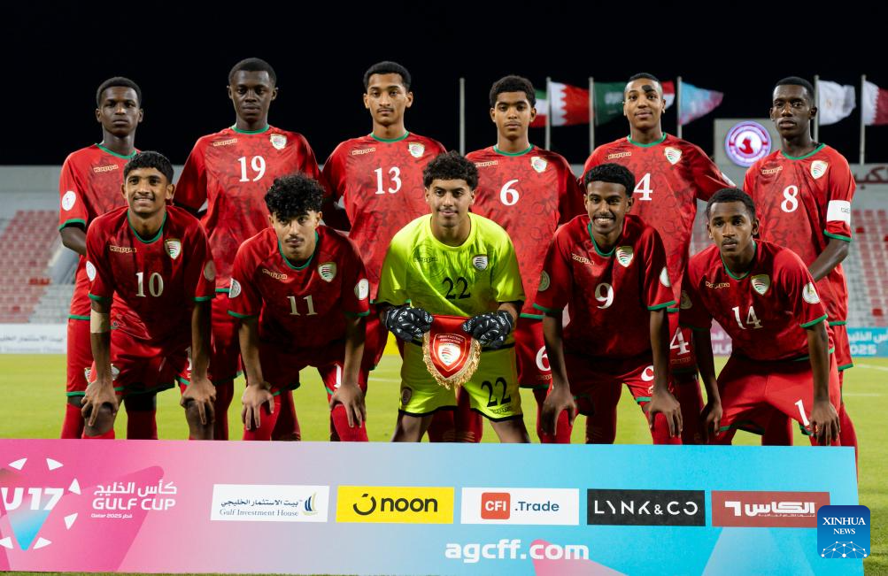 Starting players of Oman pose for a group photo prior to the Arab Gulf Cup Football Federation (AGCFF) U-17 Gulf Cup Qatar 2025 Group A football match between Oman and Qatar in Doha, Qatar, Sept. 24, 2025 (Photo by Nikku/Xinhua)