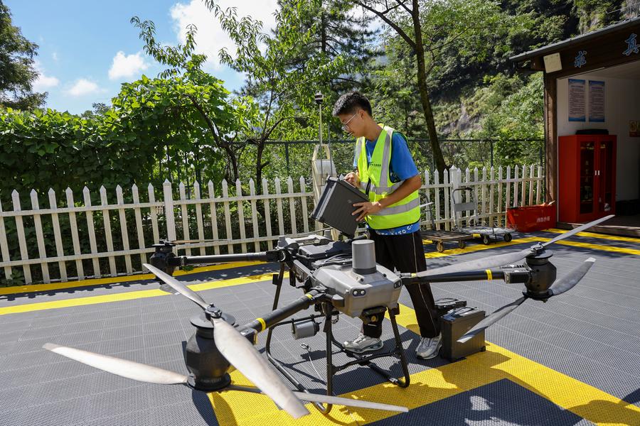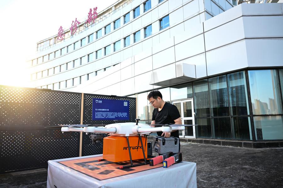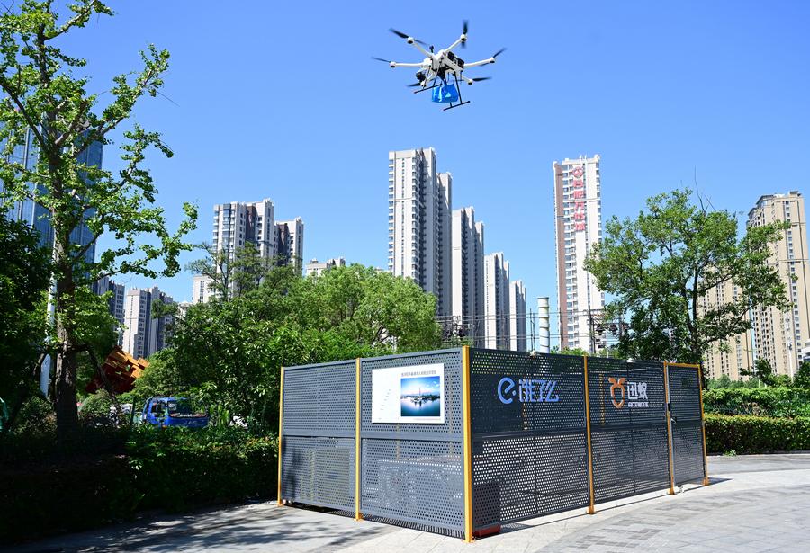 A drone photo shows a drone delivering take-out meals in Baohe District of Hefei, east China's Anhui province, Aug. 15, 2025. (Xinhua/Zhou Mu)A drone photo shows a drone transporting supplies in Huangshan scenic area in Huangshan, east China's Anhui province, Aug. 22, 2025. (Photo by Fan Chengzhu/Xinhua)A staff member receives blood bags delivered by a drone at Hefei First People's Hospital in Hefei, east China's Anhui province, Aug. 15, 2025. (Xinhua/Zhou Mu)A staff member installs battery for a drone in Huangshan scenic area in Huangshan, east China's Anhui province, Aug. 22, 2025. (Photo by Fan Chengzhu/Xinhua)A drone takes off from a site to deliver take-out meals in Baohe District of Hefei, east China's Anhui province, Aug. 15, 2025. (Xinhua/Zhou Mu)A drone delivers supplies in Huangshan scenic area in Huangshan, east China's Anhui province, Aug. 22, 2025. (Xinhua/Zhou Mu)An aerial drone photo shows a drone dropping take-out meals delivery with a rope in Baohe District of Hefei, east China's Anhui province, Aug. 15, 2025. (Xinhua/Zhou Mu)A staff member receives supplies delivered by a drone in Huangshan scenic area in Huangshan, east China's Anhui province, Aug. 22, 2025. (Xinhua/Zhou Mu)