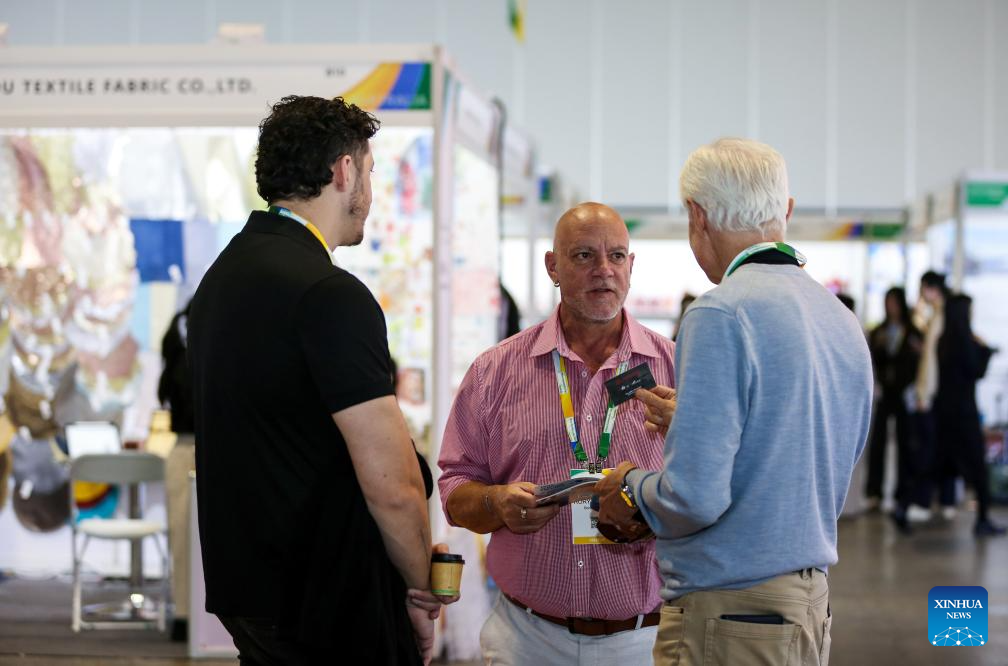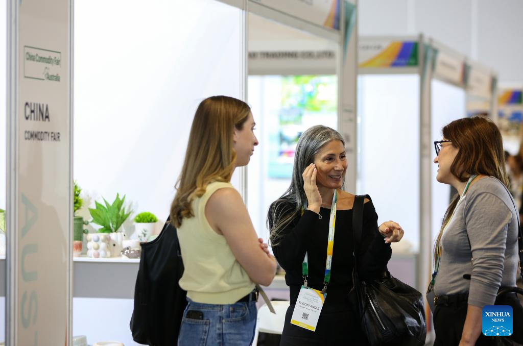 People communicate during the 2nd China Commodity Fair Australia at the International Convention Center (ICC) in Sydney, Australia, Sept. 25, 2025. The three-day fair kicked off here Thursday. (Xinhua/Ma Ping)