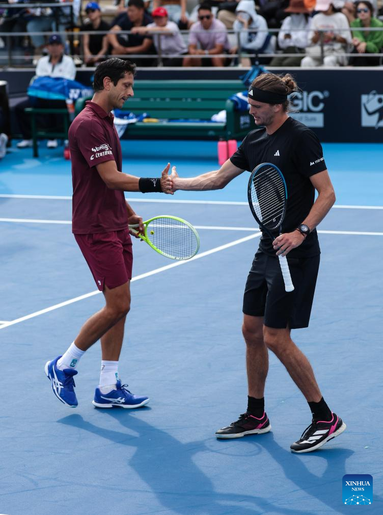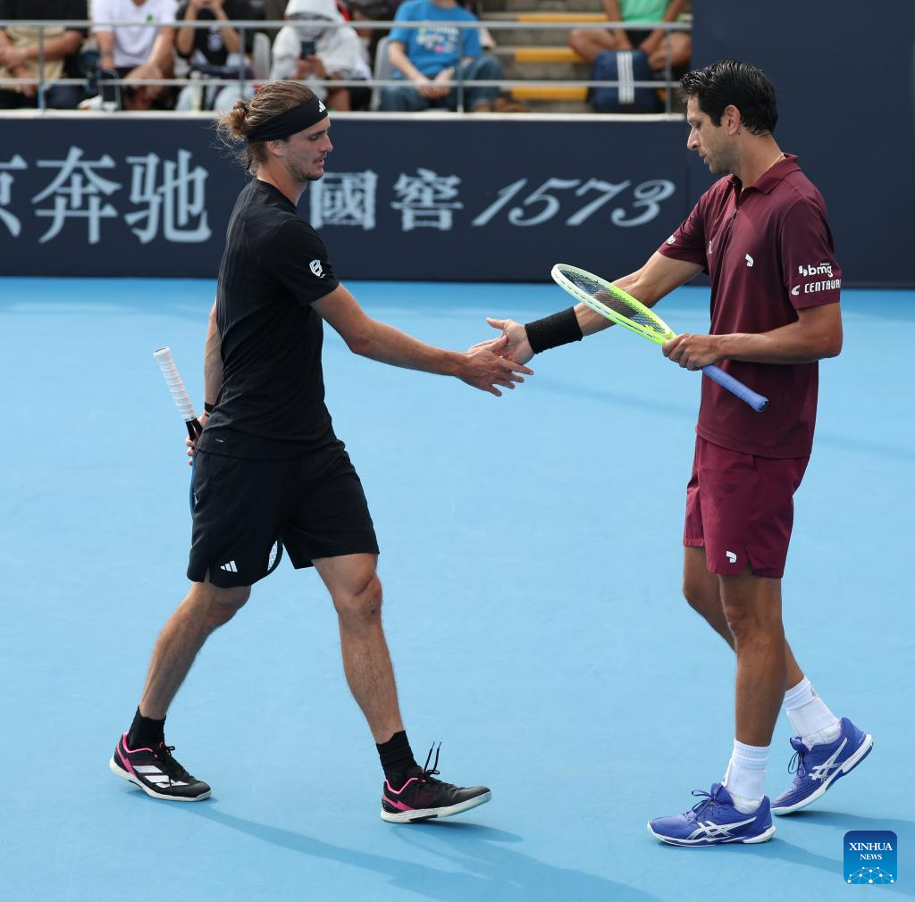 Marcelo Melo (R)/Alexander Zverev react during the men's doubles first round match between Bu Yunchaokete (China)/Cameron Norrie (Britain) and Marcelo Melo (Brazil)/Alexander Zverev (Germany) at 2025 China Open tennis tournament in Beijing, China, Sept. 25, 2025. (Photo by Ma Zihan/Xinhua)
