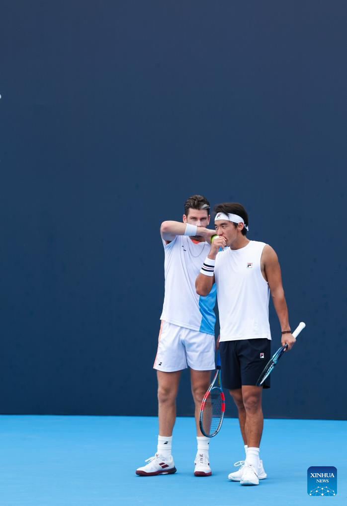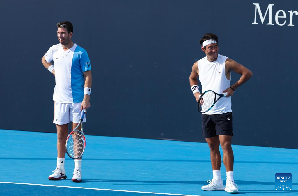Bu Yunchaokete (R)/Cameron Norrie react during the men's doubles first round match between Bu Yunchaokete (China)/Cameron Norrie (Britain) and Marcelo Melo (Brazil)/Alexander Zverev (Germany) at 2025 China Open tennis tournament in Beijing, China, Sept. 25, 2025. (Photo by Ma Zihan/Xinhua)