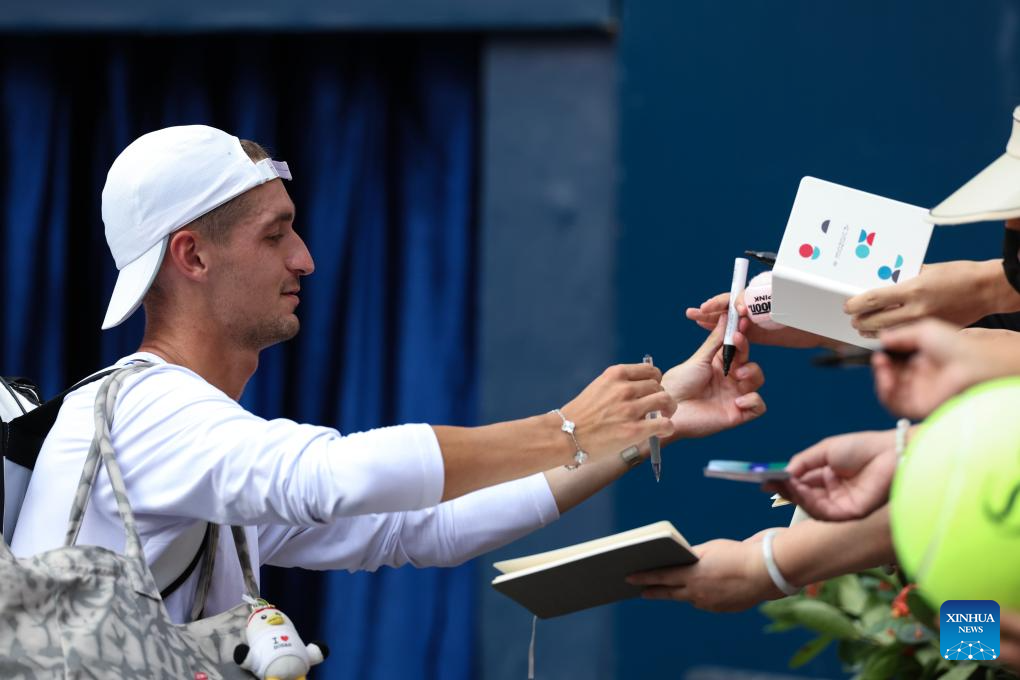 Terence Atmane signs for fans after the men's singles first round match between Zhang Zhizhen of China and Terence Atmane of France at 2025 China Open tennis tournament in Beijing, China, Sept. 25, 2025. (Photo by Ma Zihan/Xinhua)