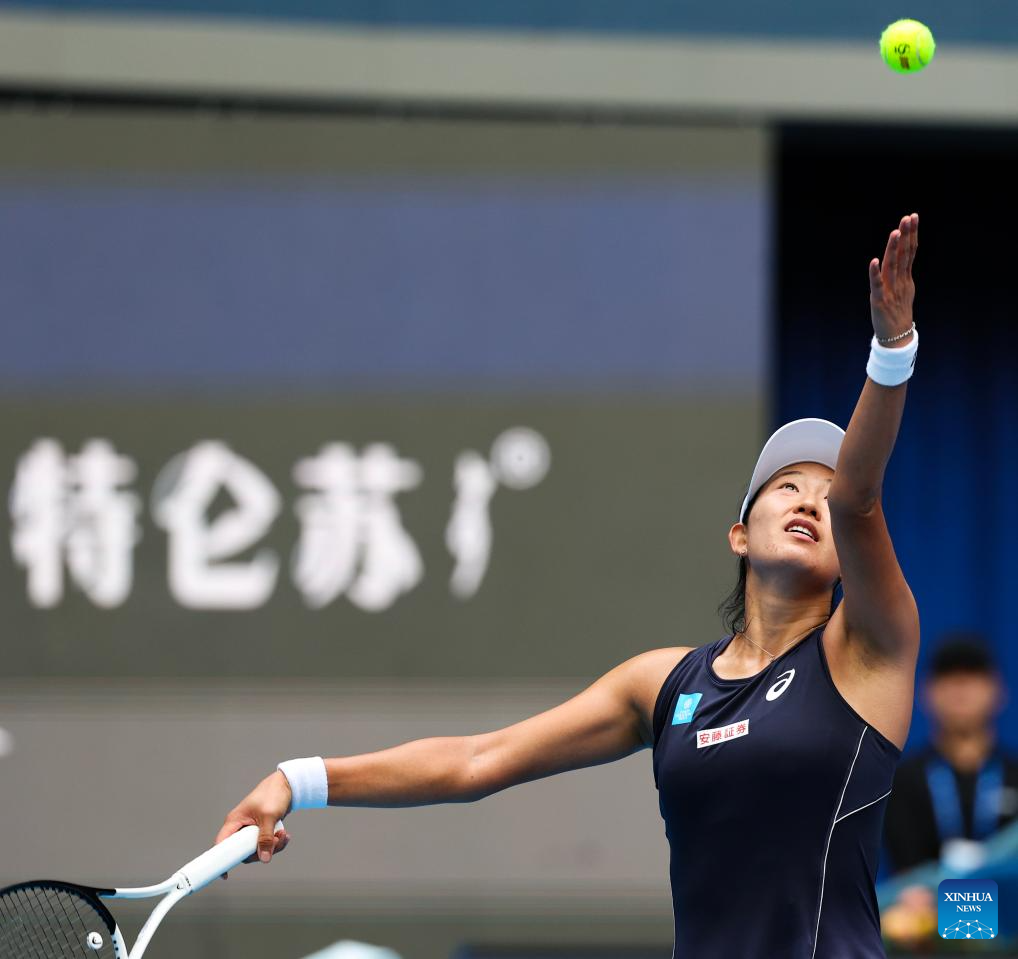 Zhu Lin hits a return during the women's singles first round match between Zhu Lin of China and Uchijima Moyuka of Japan at 2025 China Open tennis tournament in Beijing, China, Sept. 25, 2025. (Xinhua/Du Xinyi)