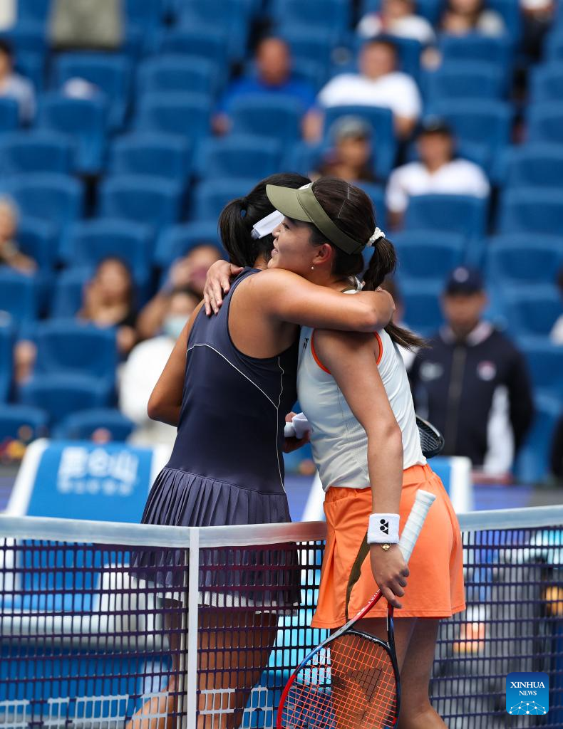 Zhu Lin (R) hugs Uchijima Moyuka after the women's singles first round match between Zhu Lin of China and Uchijima Moyuka of Japan at 2025 China Open tennis tournament in Beijing, China, Sept. 25, 2025. (Xinhua/Du Xinyi)