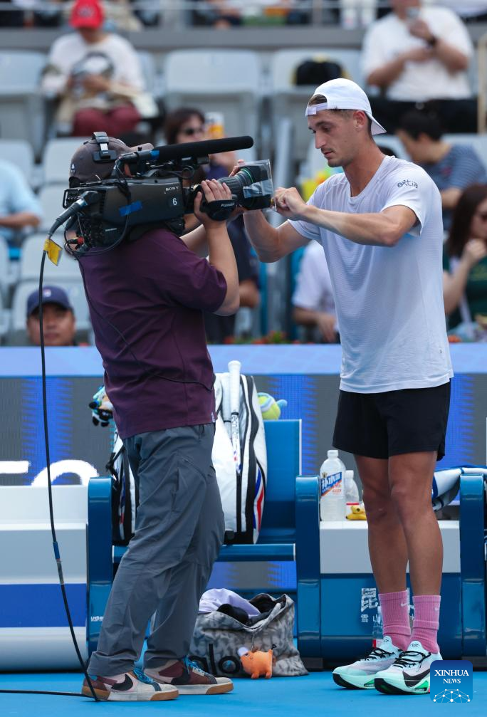 Terence Atmane (R) signs on a camera after the men's singles first round match between Zhang Zhizhen of China and Terence Atmane of France at 2025 China Open tennis tournament in Beijing, China, Sept. 25, 2025. (Photo by Ma Zihan/Xinhua)