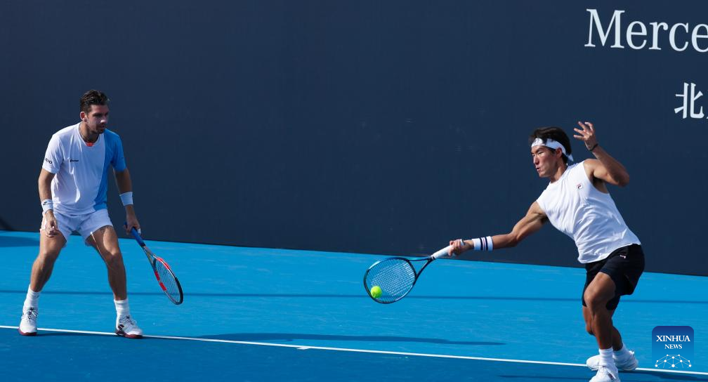 Bu Yunchaokete (R)/Cameron Norrie compete during the men's doubles first round match between Bu Yunchaokete (China)/Cameron Norrie (Britain) and Marcelo Melo (Brazil)/Alexander Zverev (Germany) at 2025 China Open tennis tournament in Beijing, China, Sept. 25, 2025. (Photo by Ma Zihan/Xinhua)