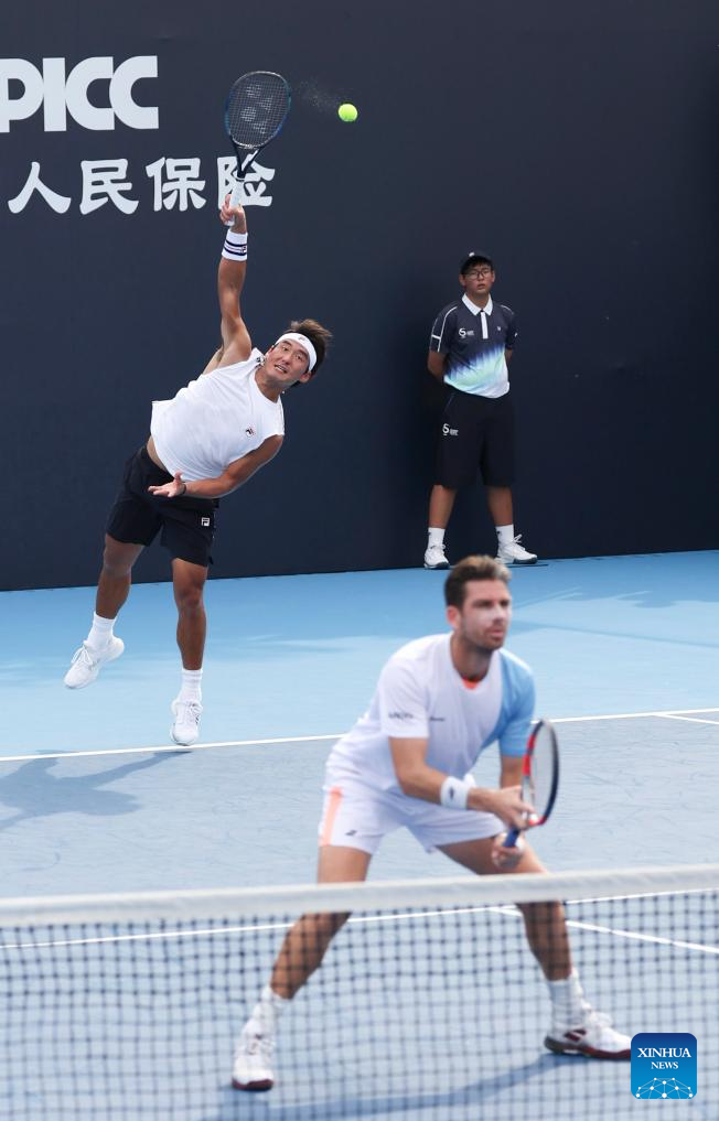 Bu Yunchaokete (L)/Cameron Norrie (front) compete during the men's doubles first round match between Bu Yunchaokete (China)/Cameron Norrie (Britain) and Marcelo Melo (Brazil)/Alexander Zverev (Germany) at 2025 China Open tennis tournament in Beijing, China, Sept. 25, 2025. (Photo by Ma Zihan/Xinhua)