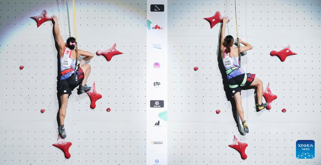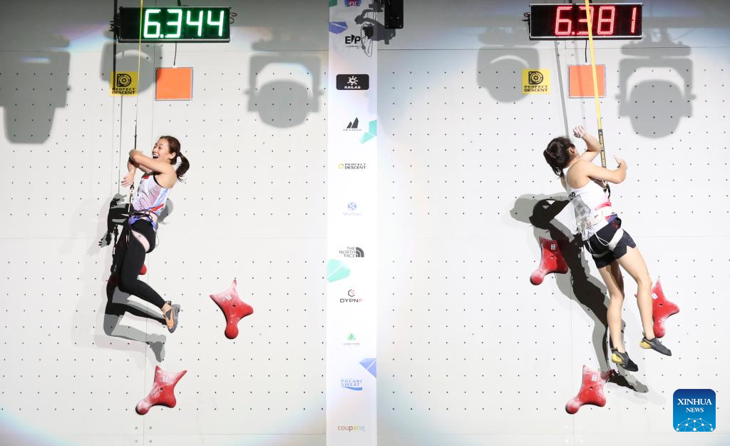 Deng Lijuan (L) of China competes with her compatriot Zhang Mengli during the women's speed quarterfinal match at the IFSC Climbing World Championships Seoul 2025 in Seoul, South Korea, Sept. 24 2025. (Xinhua/Yao Qilin)