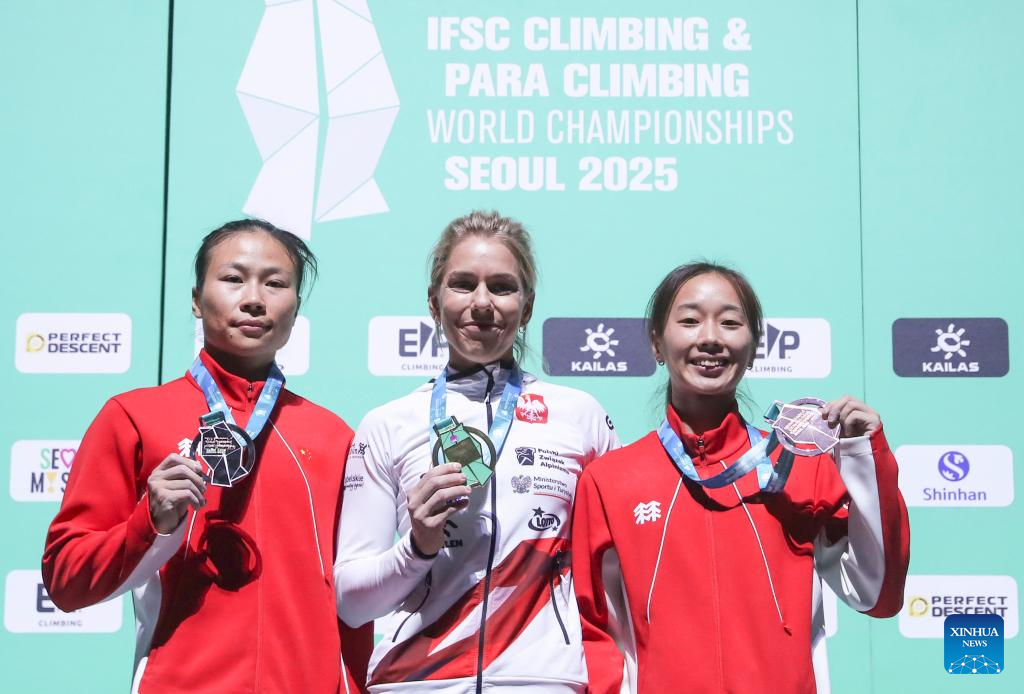 Gold medalist Aleksandra Miroslaw (C) of Poland, silver medalist Deng Lijuan (L) of China and bronze medalist Zhou Yafei of China pose during the awarding ceremony of the women's speed final match at the IFSC Climbing World Championships Seoul 2025 in Seoul, South Korea, Sept. 24 2025. (Xinhua/Yao Qilin)