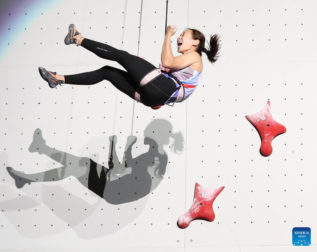 Zhou Yafei of China celebrates after the women's speed bronze medal race against Jeong Jimin of South Korea at the IFSC Climbing World Championships Seoul 2025 in Seoul, South Korea, Sept. 24 2025. (Xinhua/Yao Qilin)