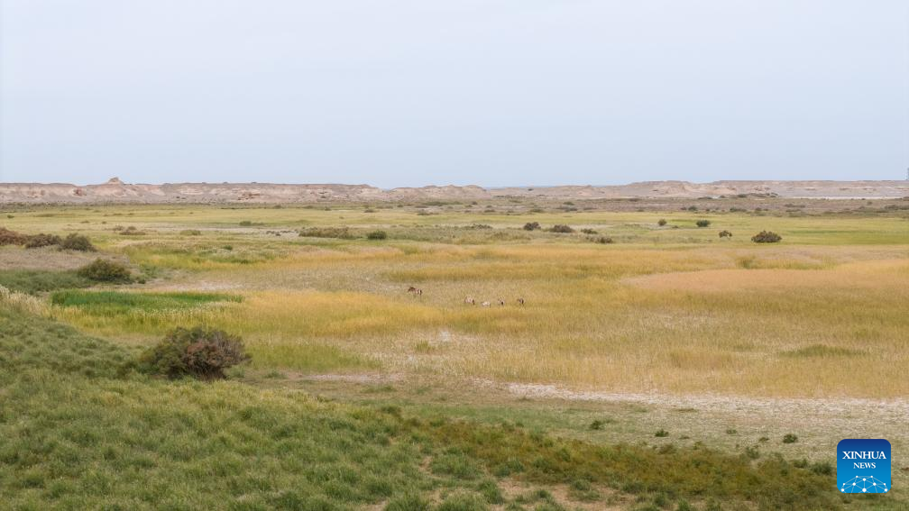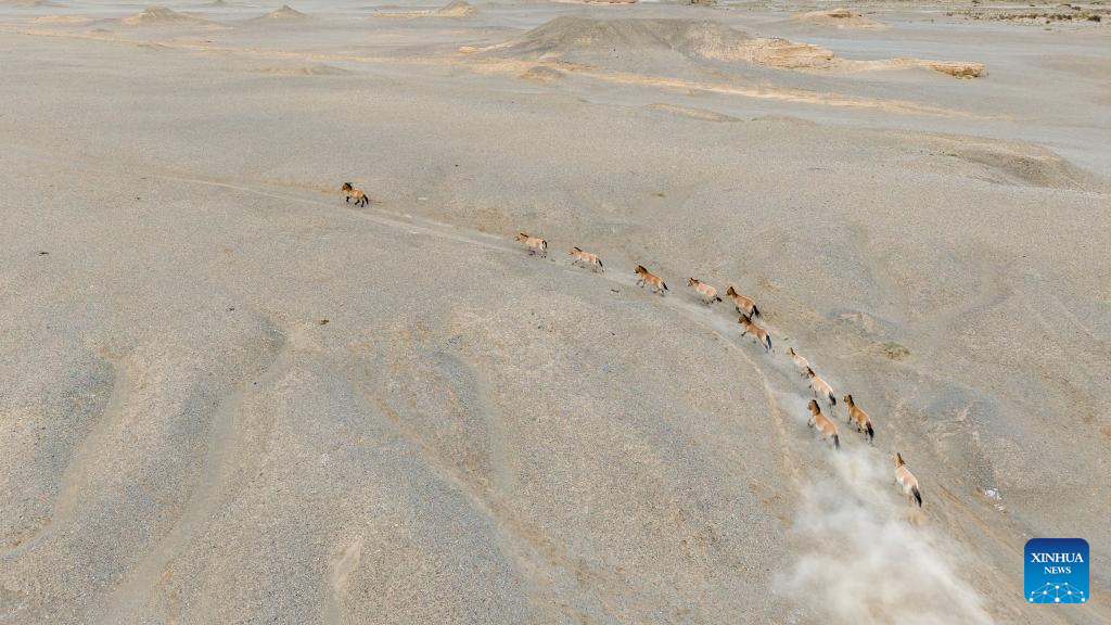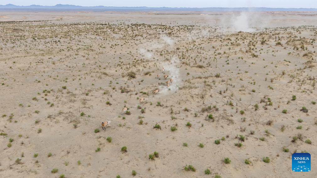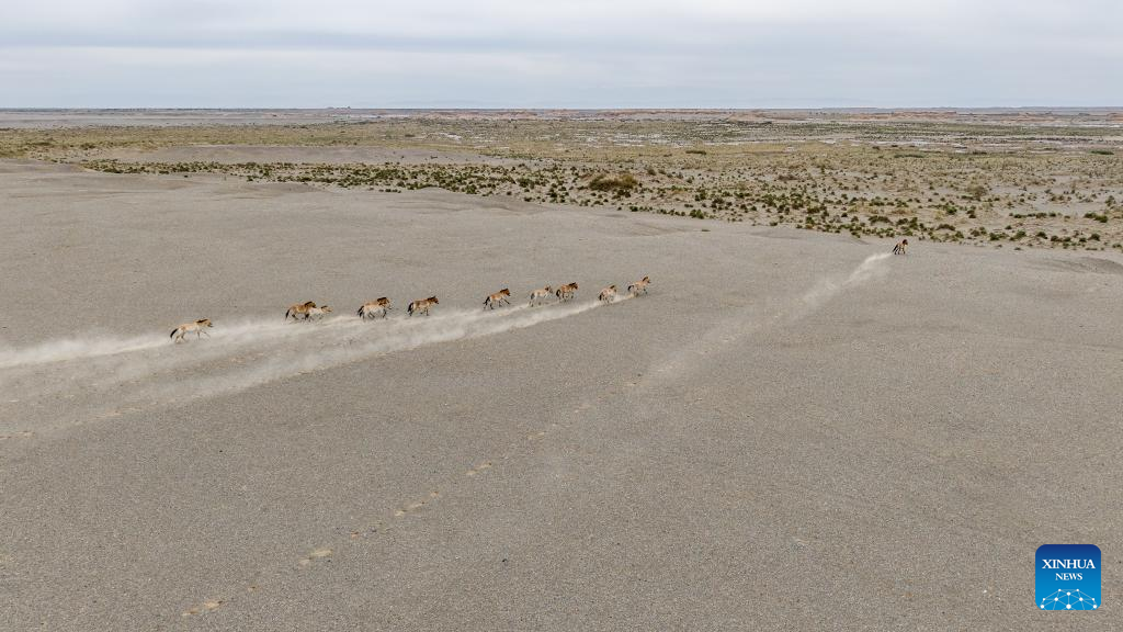 An aerial drone photo taken on Sept. 24, 2025 shows the Przewalski's horses in the Dunhuang West Lake National Nature Reserve, in Dunhuang, northwest China's Gansu Province. The Dunhuang West Lake National Nature Reserve in Gansu Province covers an area of approximately 660,000 hectares, featuring a diverse ecosystem including wetlands, grasslands, forests and Gobi deserts, which makes it an experimental zone for the wild release of the Przewalski's horses.