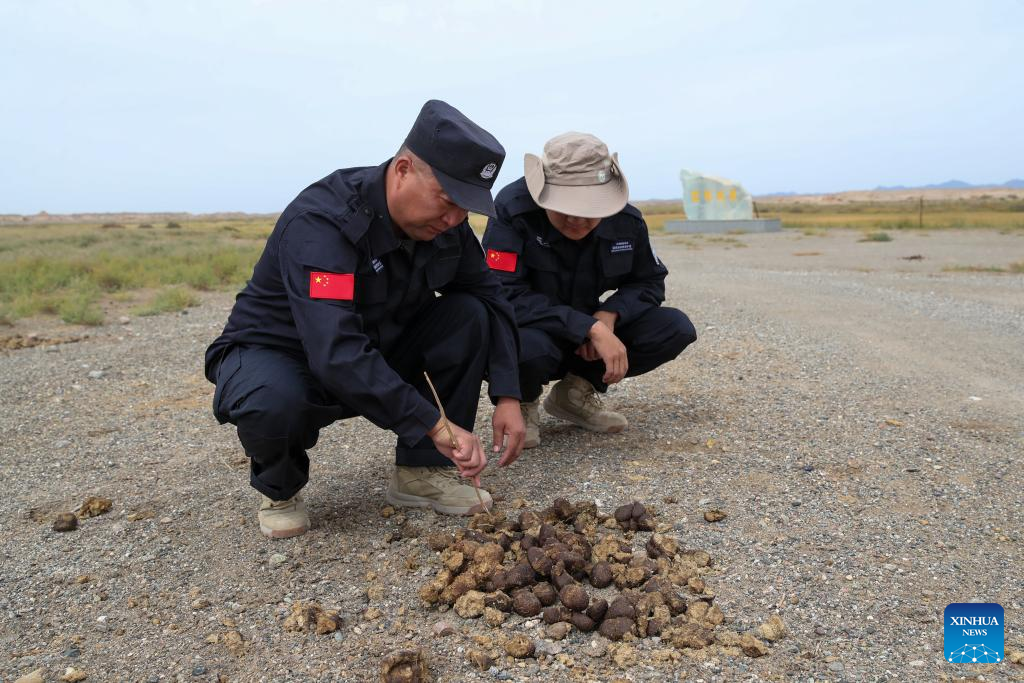 Staff members check feces of the Przewalski's horses in the Dunhuang West Lake National Nature Reserve in Dunhuang, northwest China's Gansu Province, on Sept. 24, 2025. The Dunhuang West Lake National Nature Reserve in Gansu Province covers an area of approximately 660,000 hectares, featuring a diverse ecosystem including wetlands, grasslands, forests and Gobi deserts, which makes it an experimental zone for the wild release of the Przewalski's horses.