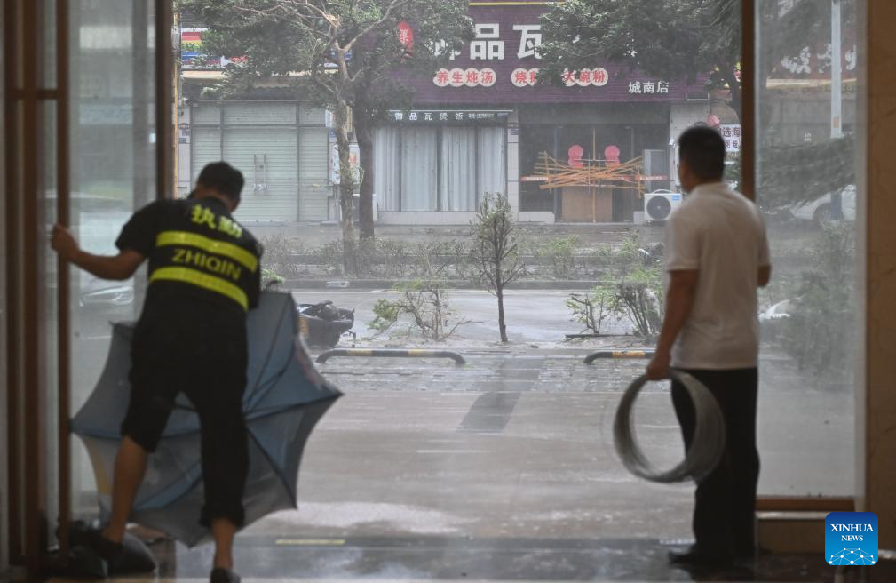 Staff members are seen on duty at the entrance of a hotel in Yangjiang City, south China's Guangdong Province, on Sept. 24, 2025. More than 2.16 million local residents had been relocated in south China's Guangdong Province as of 4 p.m. on Wednesday in response to Typhoon Ragasa, which made landfall in the province at about 5 p.m.