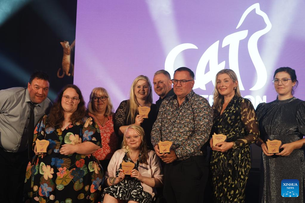 Owners and representatives of the winning cats of the National Cat Awards 2025 pose for photos at an awarding ceremony in London, Britain, on Sept. 24, 2025. Tales of extraordinary cats and their owners' journeys of hope and healing took center stage in London on Wednesday night, at a ceremony hosted by the century-old British charity Cats Protection for the 17th National Cat Awards.