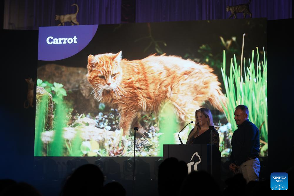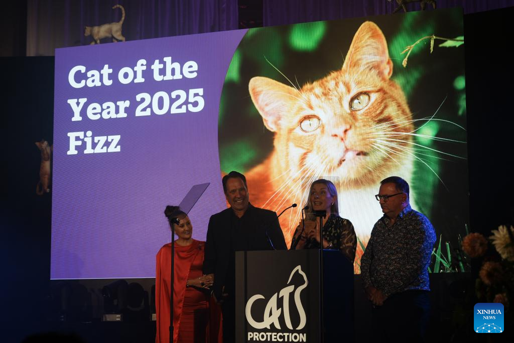 Representatives collect an award as Fizz, a four-year-old ginger tom from Powys, Wales, wins the "Cat of the Year 2025" award of the National Cat Awards 2025 at an awarding ceremony in London, Britain, Sept. 24, 2025. Tales of extraordinary cats and their owners' journeys of hope and healing took center stage in London on Wednesday night, at a ceremony hosted by the century-old British charity Cats Protection for the 17th National Cat Awards.