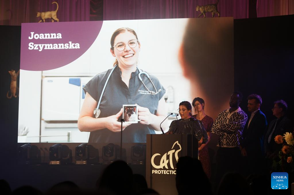 Joanna Szymanska (1st L), the winner of the "Vet of the Year" award of the National Cat Awards 2025, speaks at an awarding ceremony in London, Britain, Sept. 24, 2025. Tales of extraordinary cats and their owners' journeys of hope and healing took center stage in London on Wednesday night, at a ceremony hosted by the century-old British charity Cats Protection for the 17th National Cat Awards. (Xinhua/Zhao Jiasong)