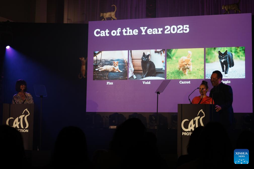 Presenters reveal the image of Void, the winning cat of the Incredible Cats category of the National Cat Awards 2025, at an awarding ceremony in London, Britain, Sept. 24, 2025. Tales of extraordinary cats and their owners' journeys of hope and healing took center stage in London on Wednesday night, at a ceremony hosted by the century-old British charity Cats Protection for the 17th National Cat Awards.