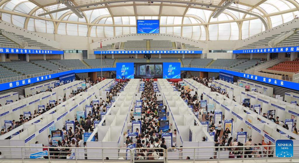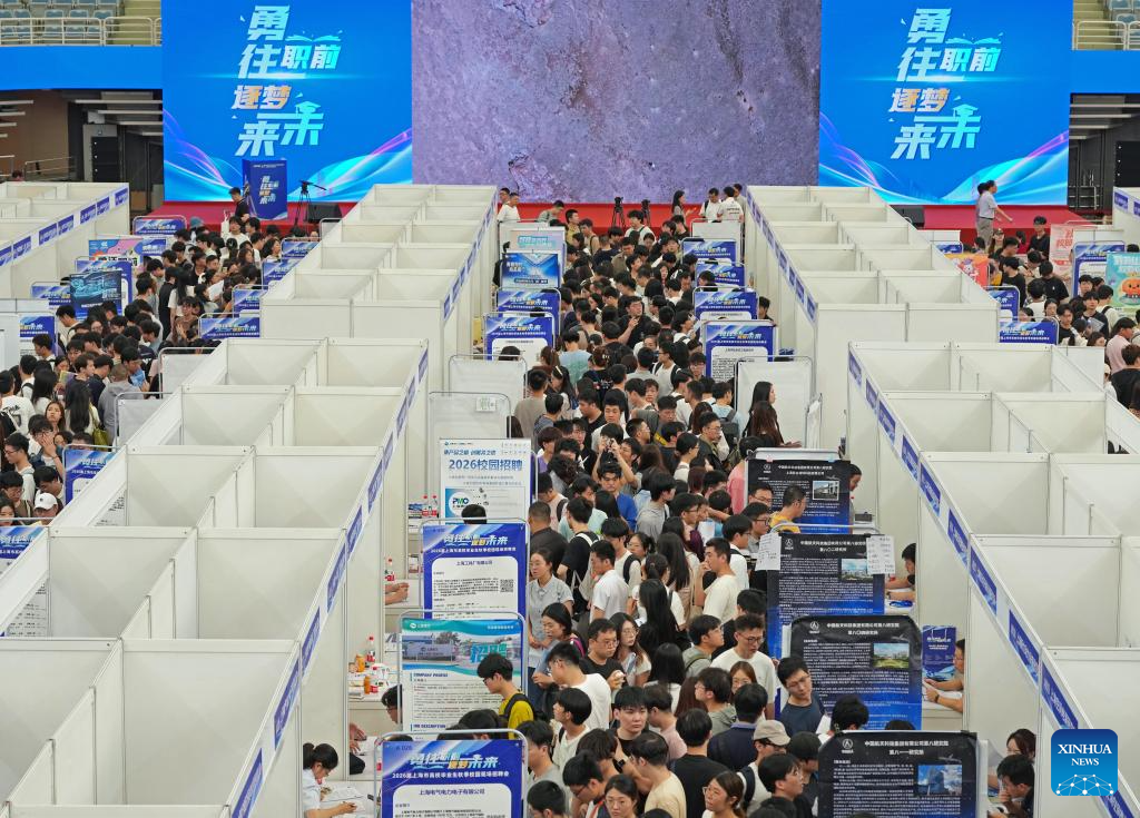 This photo taken on Sept. 26, 2025 shows a scene at an autumn campus job fair for Shanghai university graduates at the Minhang campus of Shanghai Jiao Tong University in east China's Shanghai. The job fair kicked off here on Friday, with the participation of more than 1,000 employers and providing about 35,000 jobs. (Xinhua/Liu Ying)