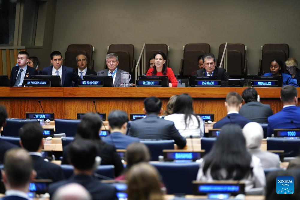 United Nations General Assembly President Annalena Baerbock (front row, 3rd R) speaks during a high-level meeting marking the 30th anniversary of the World Programme of Action for Youth (WPAY) at the UN headquarters in New York, Sept. 25, 2025. (Xinhua/Wu Xiaoling)
