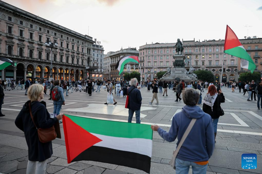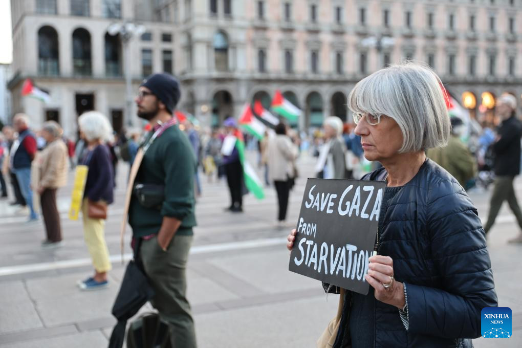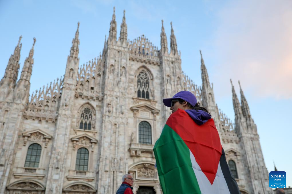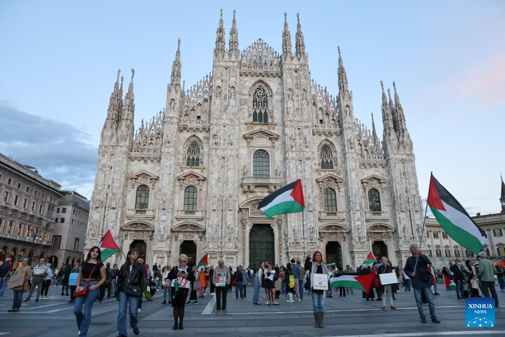 People participate in a pro-Palestine protest in front of Milan Cathedral, Italy, Sept. 25, 2025. (Xinhua/Li Jing)