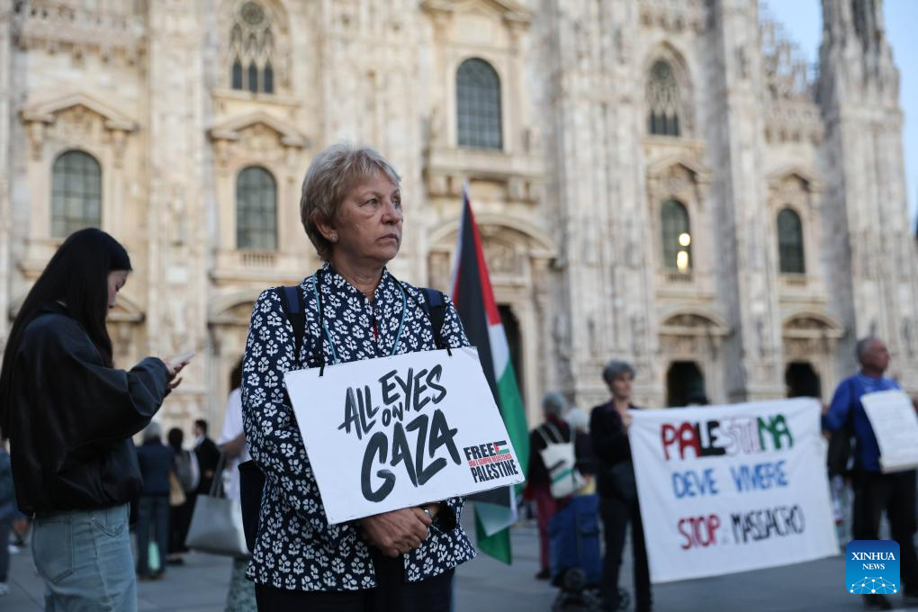 People participate in a pro-Palestine protest in front of the Milan Cathedral in Milan, Italy, Sept. 25, 2025. (Xinhua/Li Jing)
