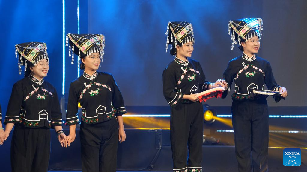 A choir from southwest China's Yunnan Province stages a performance during a China-Vietnam Mid-Autumn Festival Gala in Hanoi, Vietnam, Sept. 25, 2025. The gala was held on Thursday in the Vietnamese capital Hanoi, bringing together artists and performing troupes from the two nations on the same stage to celebrate the approaching festival. (Xinhua/Hu Jiali)