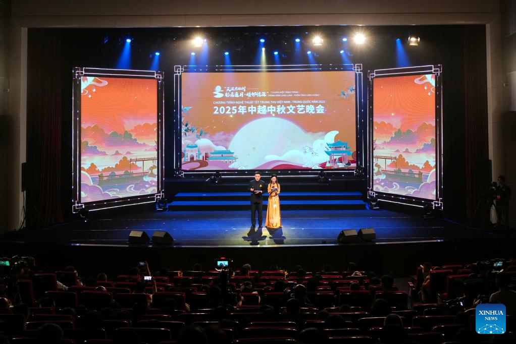 This photo taken on Sept. 25, 2025 shows a scene of a China-Vietnam Mid-Autumn Festival Gala in Hanoi, Vietnam. The gala was held on Thursday in the Vietnamese capital Hanoi, bringing together artists and performing troupes from the two nations on the same stage to celebrate the approaching festival. (Xinhua/Liu Ying)