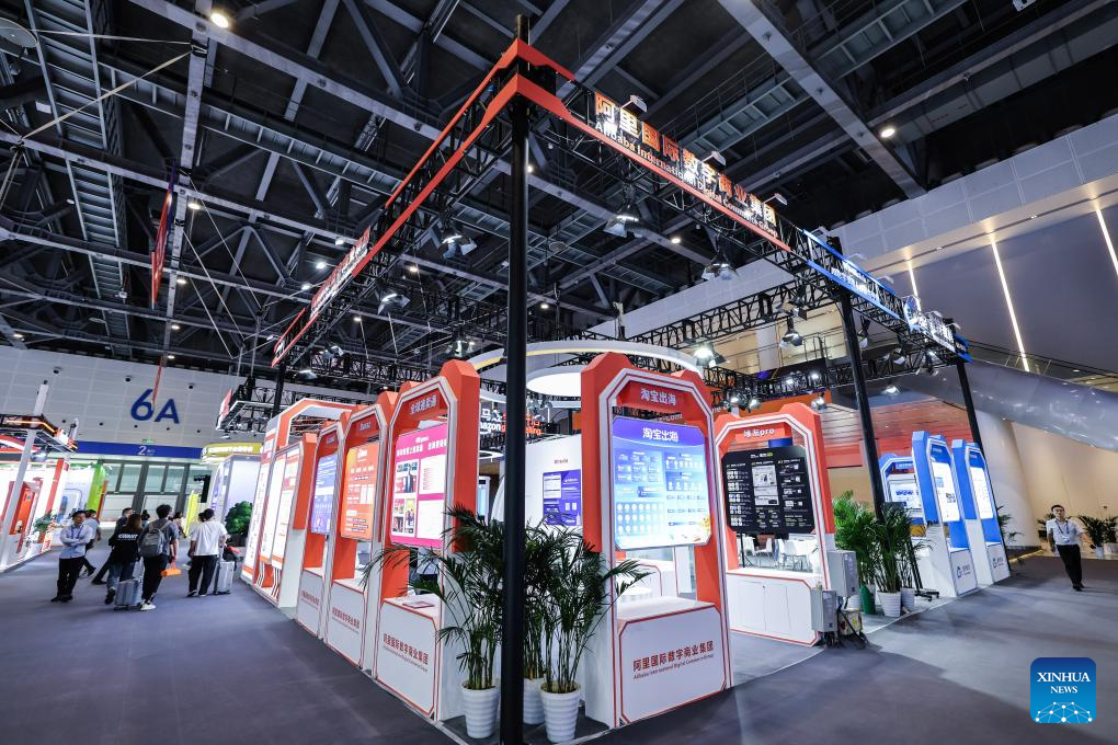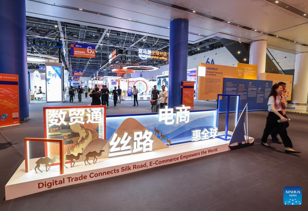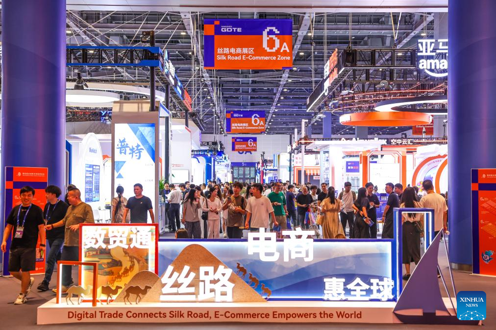 People visit the Silk Road e-commerce zone at the 4th Global Digital Trade Expo in Hangzhou, east China's Zhejiang Province, Sept. 25, 2025. The 4th Global Digital Trade Expo, an event that promotes digital trade and industrial cooperation among partners, kicked off in Hangzhou on Thursday, with the participation of more than 1,800 exhibitors. The total exhibition area covers 155,000 square meters. (Xinhua/Jiang Han)