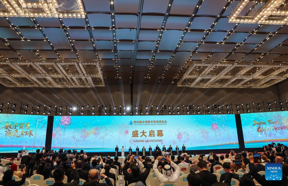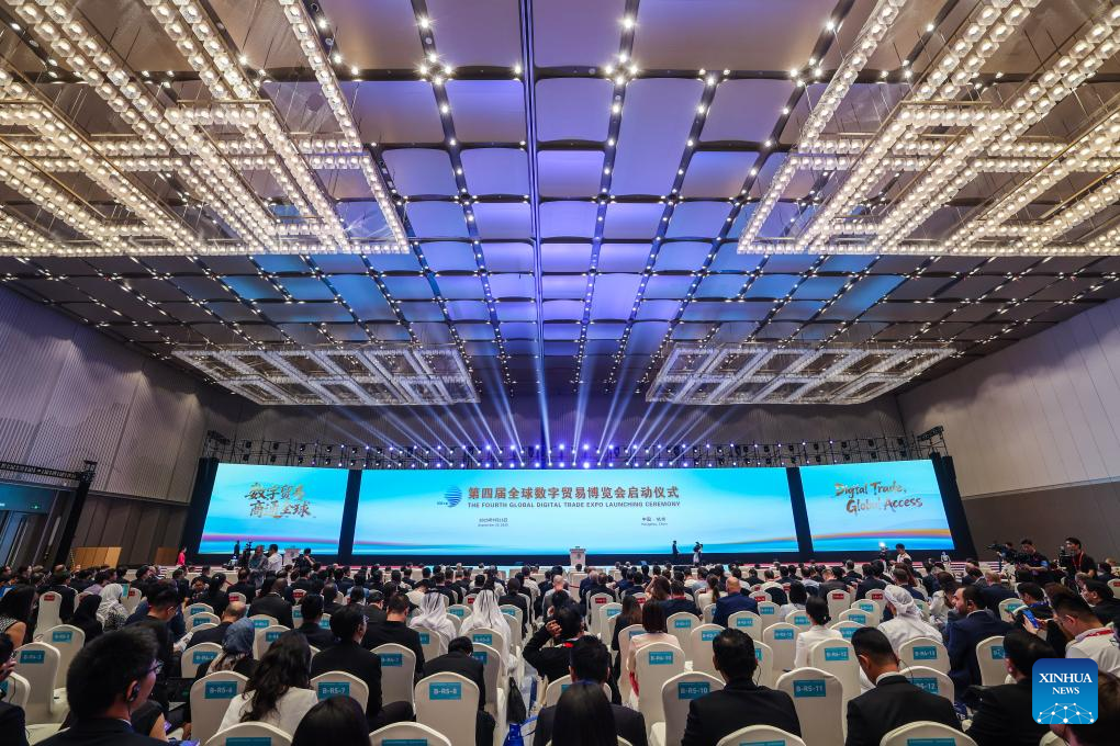 A launching ceremony of the 4th Global Digital Trade Expo is held in Hangzhou, east China's Zhejiang Province, Sept. 25, 2025. The 4th Global Digital Trade Expo, an event that promotes digital trade and industrial cooperation among partners, kicked off in Hangzhou on Thursday, with the participation of more than 1,800 exhibitors. The total exhibition area covers 155,000 square meters. (Xinhua/Xu Yu)