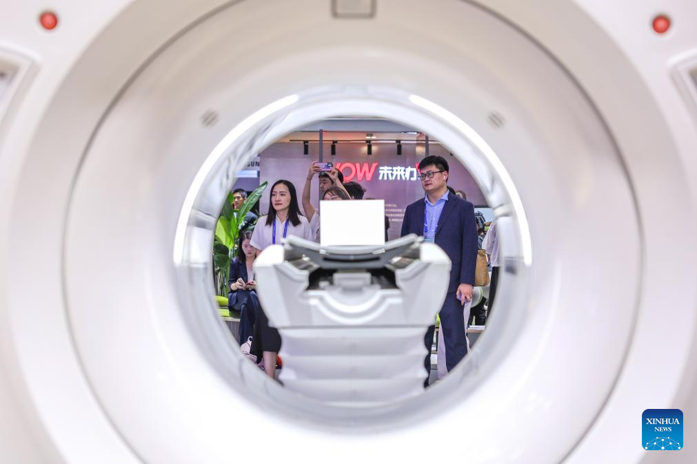 Visitors learn about intelligent medical equipment at the 4th Global Digital Trade Expo in Hangzhou, east China's Zhejiang Province, Sept. 25, 2025. The 4th Global Digital Trade Expo, an event that promotes digital trade and industrial cooperation among partners, kicked off in Hangzhou on Thursday, with the participation of more than 1,800 exhibitors. The total exhibition area covers 155,000 square meters. (Xinhua/Jiang Han)