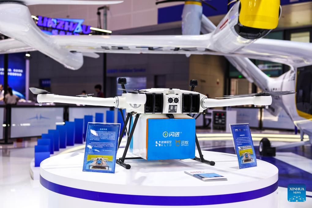 This photo taken on Sept. 25, 2025 shows a delivery drone at the 4th Global Digital Trade Expo in Hangzhou, east China's Zhejiang Province. The 4th Global Digital Trade Expo, an event that promotes digital trade and industrial cooperation among partners, kicked off in Hangzhou on Thursday, with the participation of more than 1,800 exhibitors. The total exhibition area covers 155,000 square meters. (Xinhua/Jiang Han)