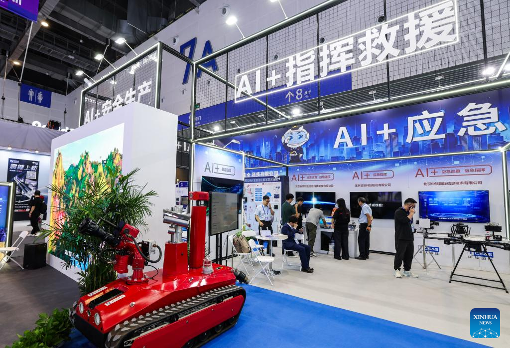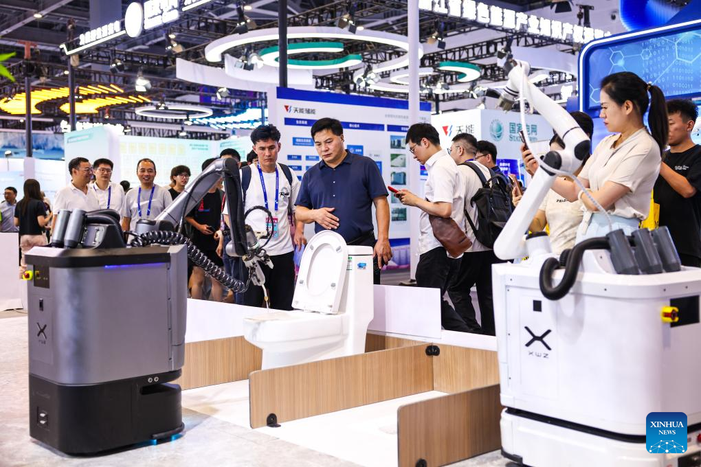 People visit the artificial intelligence exhibition zone at the 4th Global Digital Trade Expo in Hangzhou, east China's Zhejiang Province, Sept. 25, 2025. The 4th Global Digital Trade Expo, an event that promotes digital trade and industrial cooperation among partners, kicked off in Hangzhou on Thursday, with the participation of more than 1,800 exhibitors. The total exhibition area covers 155,000 square meters. (Xinhua/Xu Yu)