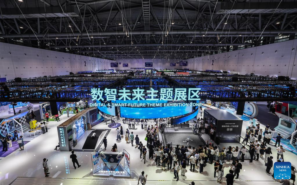 People visit the digital and smart future theme exhibition zone at the 4th Global Digital Trade Expo in Hangzhou, east China's Zhejiang Province, Sept. 25, 2025. The 4th Global Digital Trade Expo, an event that promotes digital trade and industrial cooperation among partners, kicked off in Hangzhou on Thursday, with the participation of more than 1,800 exhibitors. The total exhibition area covers 155,000 square meters. (Xinhua/Xu Yu)