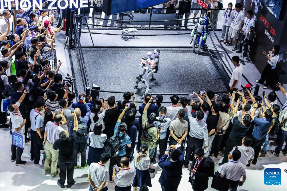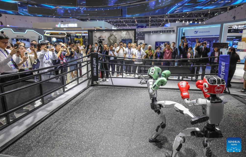A humanoid robot boxing competition is staged at the 4th Global Digital Trade Expo in Hangzhou, east China's Zhejiang Province, Sept. 25, 2025. The 4th Global Digital Trade Expo, an event that promotes digital trade and industrial cooperation among partners, kicked off in Hangzhou on Thursday, with the participation of more than 1,800 exhibitors. The total exhibition area covers 155,000 square meters. (Xinhua/Xu Yu)