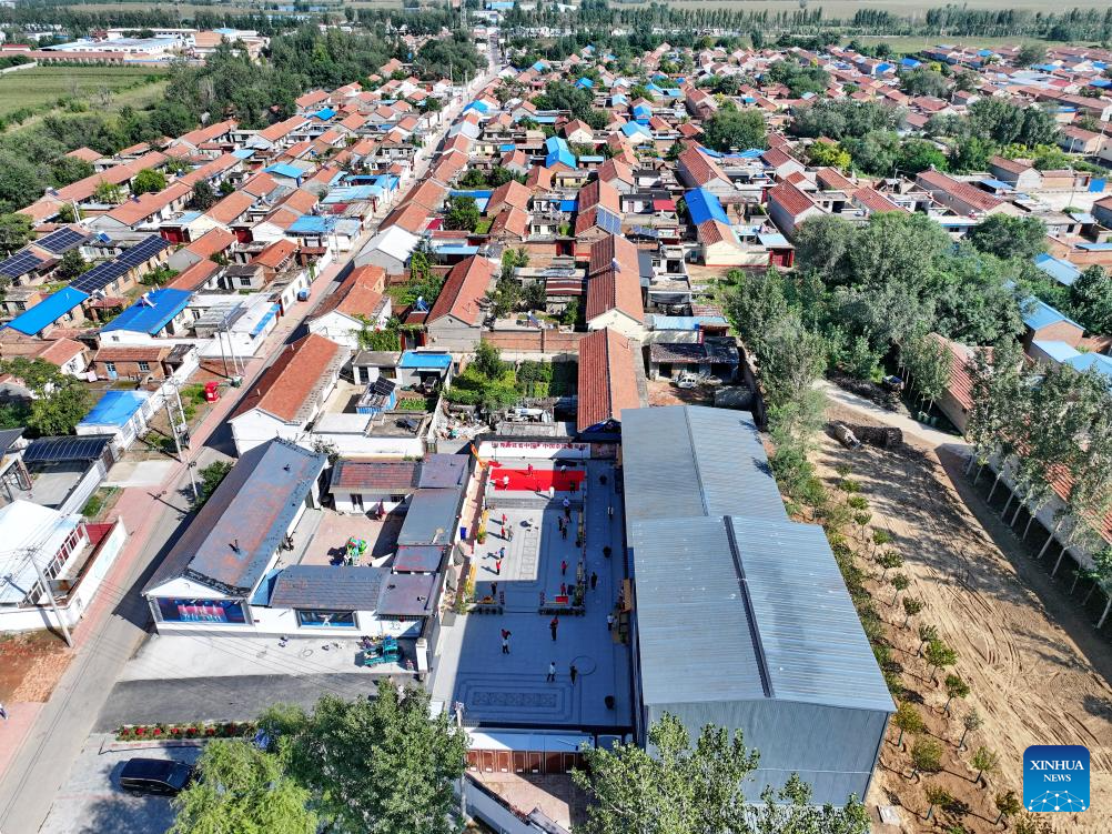 An aerial drone photo taken on Sept. 25, 2025 shows a view of Zhang Shuo's acrobatic courtyard in Sangyuan Town, Wuqiao County, north China's Hebei Province. Wuqiao, dubbed the cradle of Chinese acrobatic art, boasts 14 diverse "acrobatic courtyards" that serve as a cluster of bases for artist training, new play designing, and folk art research. (Xinhua/Mu Yu)