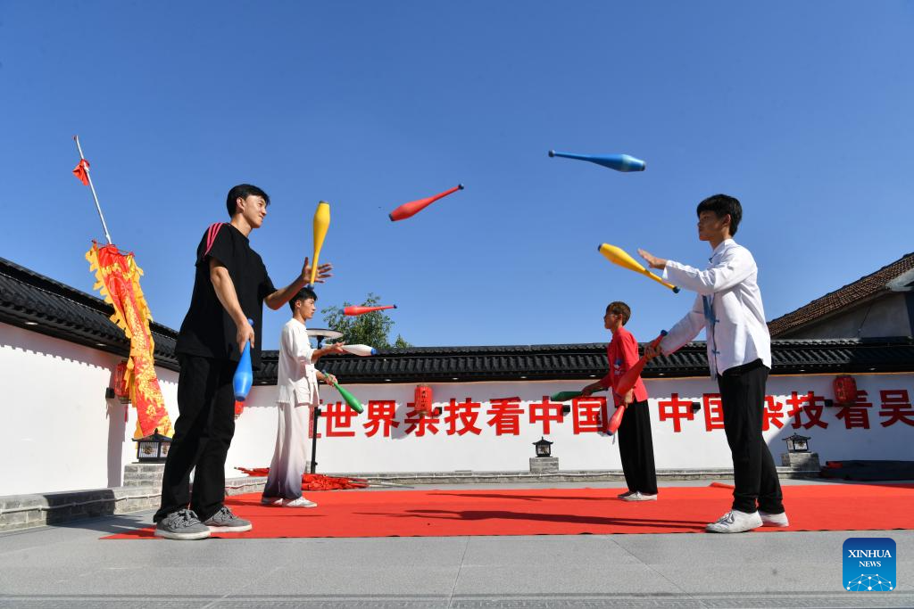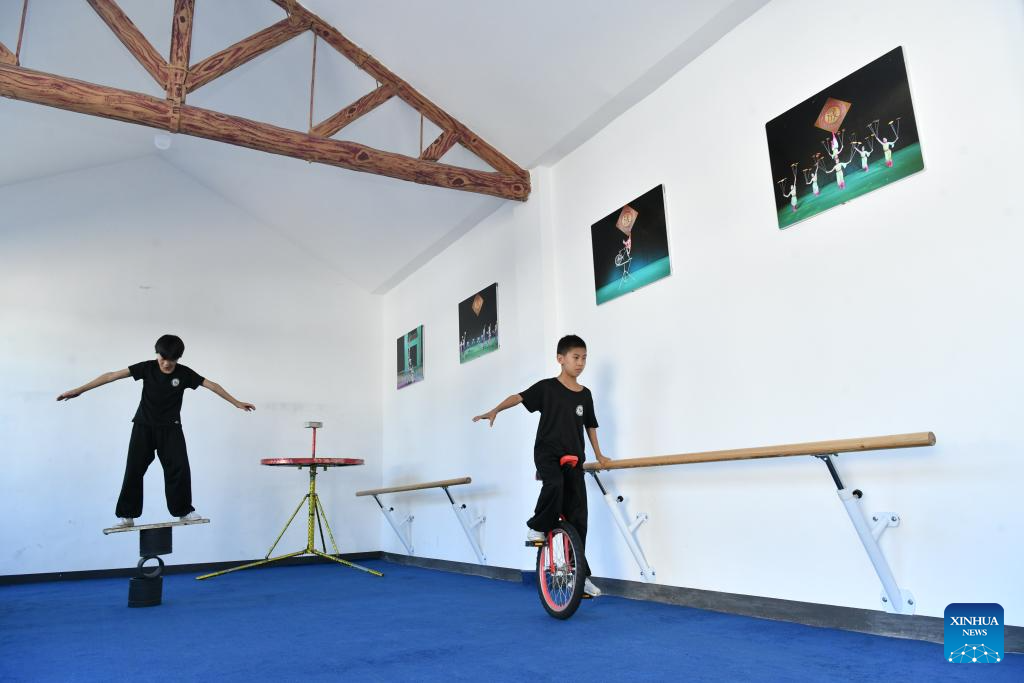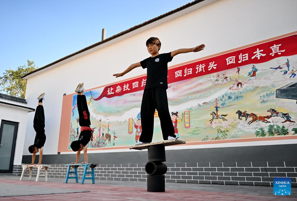 Students practice acrobatic skills at Zhang Shuo's acrobatic courtyard in Sangyuan Town, Wuqiao County, north China's Hebei Province, on Sept. 25, 2025. Wuqiao, dubbed the cradle of Chinese acrobatic art, boasts 14 diverse "acrobatic courtyards" that serve as a cluster of bases for artist training, new play designing, and folk art research. (Xinhua/Mu Yu)