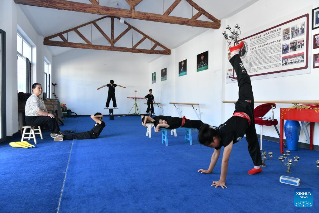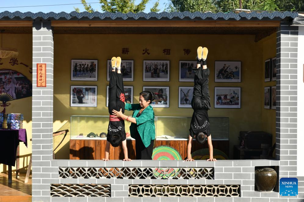 Students practice acrobatic skills at the Diao's Troupe acrobatic courtyard in Sangyuan Town, Wuqiao County, north China's Hebei Province, on Sept. 25, 2025. Wuqiao, dubbed the cradle of Chinese acrobatic art, boasts 14 diverse "acrobatic courtyards" that serve as a cluster of bases for artist training, new play designing, and folk art research. (Xinhua/Mu Yu)