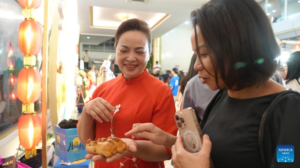 This photo taken on Sept. 25, 2025 shows mooncakes made by Vietnamese mooncake artisan Dinh Thi Tu Anh at the Vietnam National Opera and Ballet in Hanoi, Vietnam. (Xinhua/Hu Jiali)