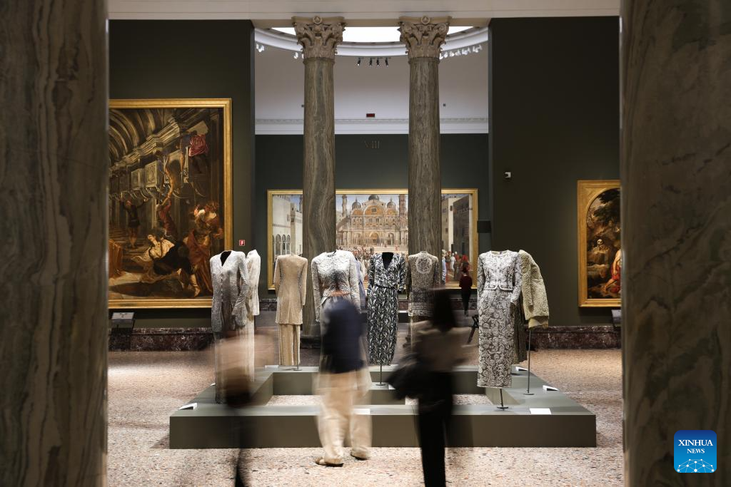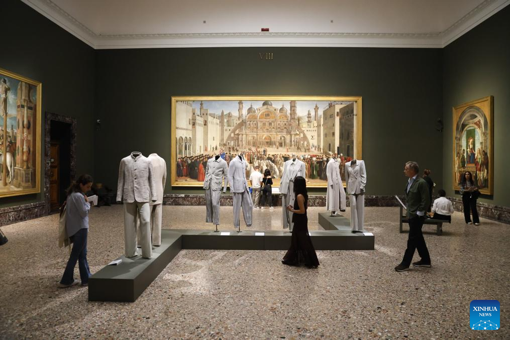 People watch creations displayed at "Giorgio Armani: Milano, per amore" exhibition at Brera Art Gallery in Milan, Italy, Sept. 25, 2025. Over 120 creations from Armani/Archivio are displayed among paintings of Brera Art Gallery from Sept. 24, 2025 to Jan. 11, 2026, to honor the stylistic journey of Italian fashion designer Giorgio Armani, who passed away on Sept. 4, 2025. (Xinhua/Li Jing)