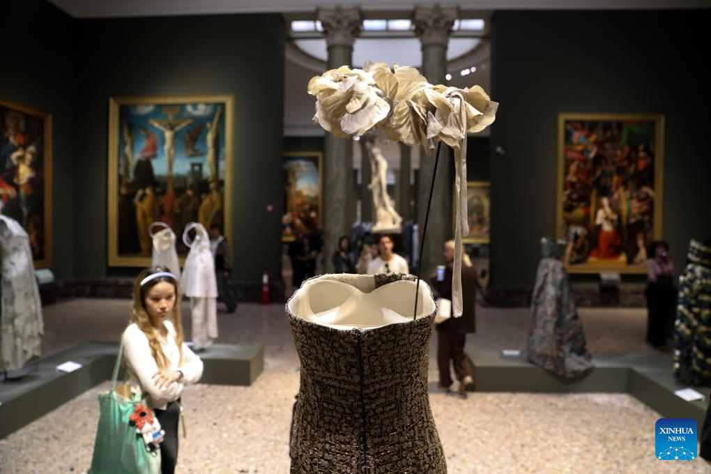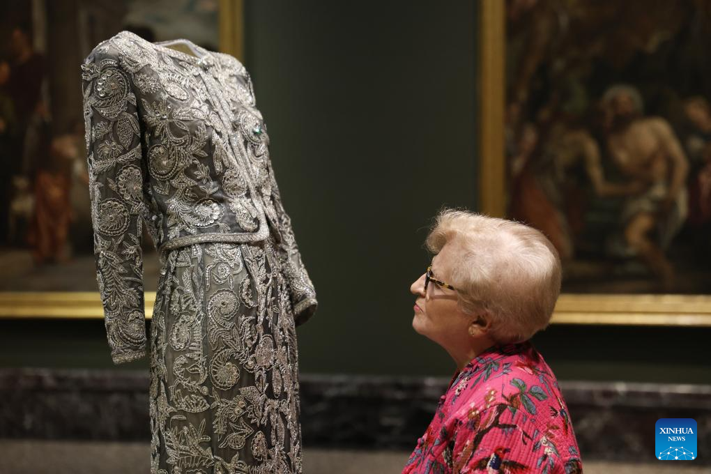 A woman watches a creation displayed at "Giorgio Armani: Milano, per amore" exhibition at Brera Art Gallery in Milan, Italy, Sept. 25, 2025. Over 120 creations from Armani/Archivio are displayed among paintings of Brera Art Gallery from Sept. 24, 2025 to Jan. 11, 2026, to honor the stylistic journey of Italian fashion designer Giorgio Armani, who passed away on Sept. 4, 2025. (Xinhua/Li Jing)