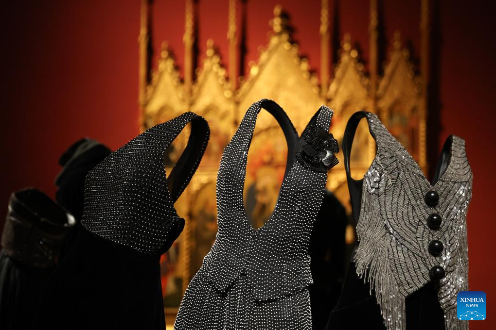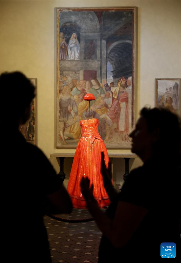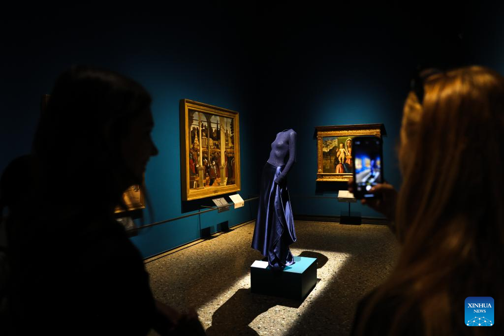 People watch a creation displayed at "Giorgio Armani: Milano, per amore" exhibition at Brera Art Gallery in Milan, Italy, Sept. 25, 2025. Over 120 creations from Armani/Archivio are displayed among paintings of Brera Art Gallery from Sept. 24, 2025 to Jan. 11, 2026, to honor the stylistic journey of Italian fashion designer Giorgio Armani, who passed away on Sept. 4, 2025. (Xinhua/Li Jing)