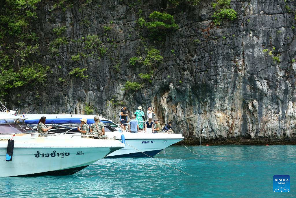Tourists enjoy themselves at Phi Phi islands in Krabi, Thailand, Sept. 25, 2025. Phi Phi Islands, located in the central area of the Andaman Sea, are known for their clear sea water and cliff sights. (Xinhua/Sun Weitong)