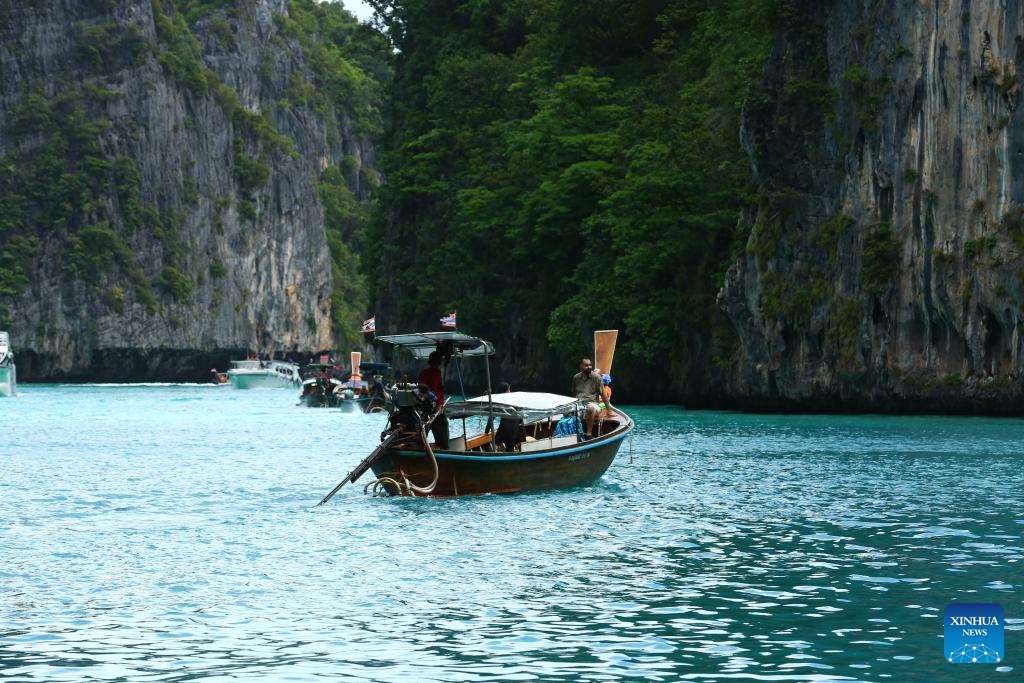 Tourists take boats for sightseeing at Phi Phi islands in Krabi, Thailand, Sept. 25, 2025. Phi Phi Islands, located in the central area of the Andaman Sea, are known for their clear sea water and cliff sights. (Xinhua/Sun Weitong)