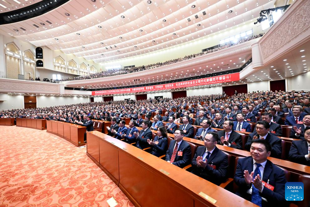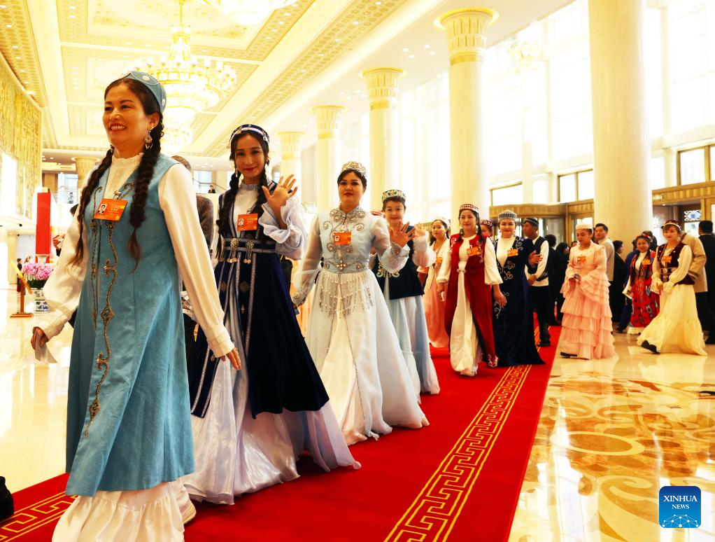 Participants walk into the Xinjiang People's Hall prior to a grand gathering in celebration of the 70th founding anniversary of the Xinjiang Uygur Autonomous Region, in Urumqi, capital of this region in northwest China, on Sept. 25, 2025. (Xinhua/Chen Bin)